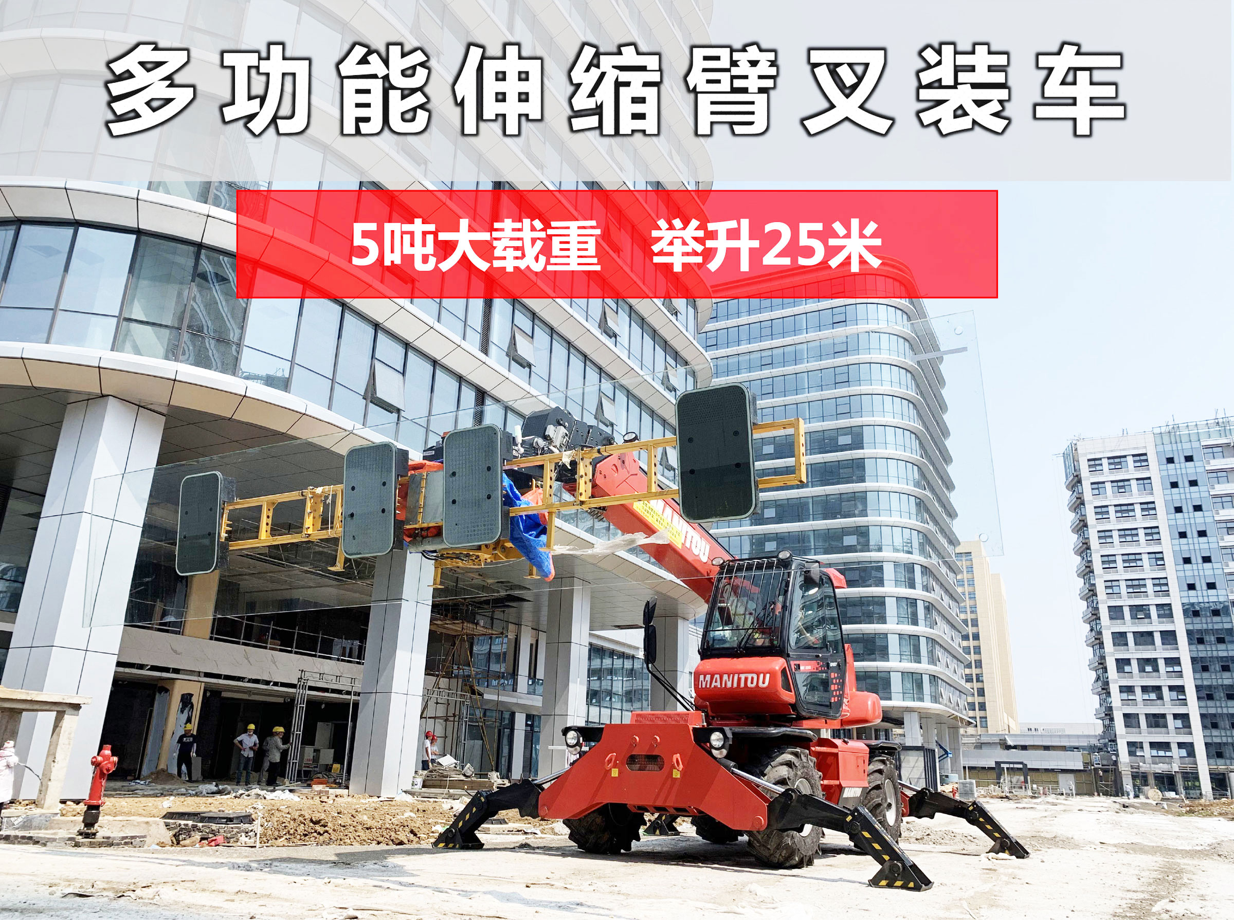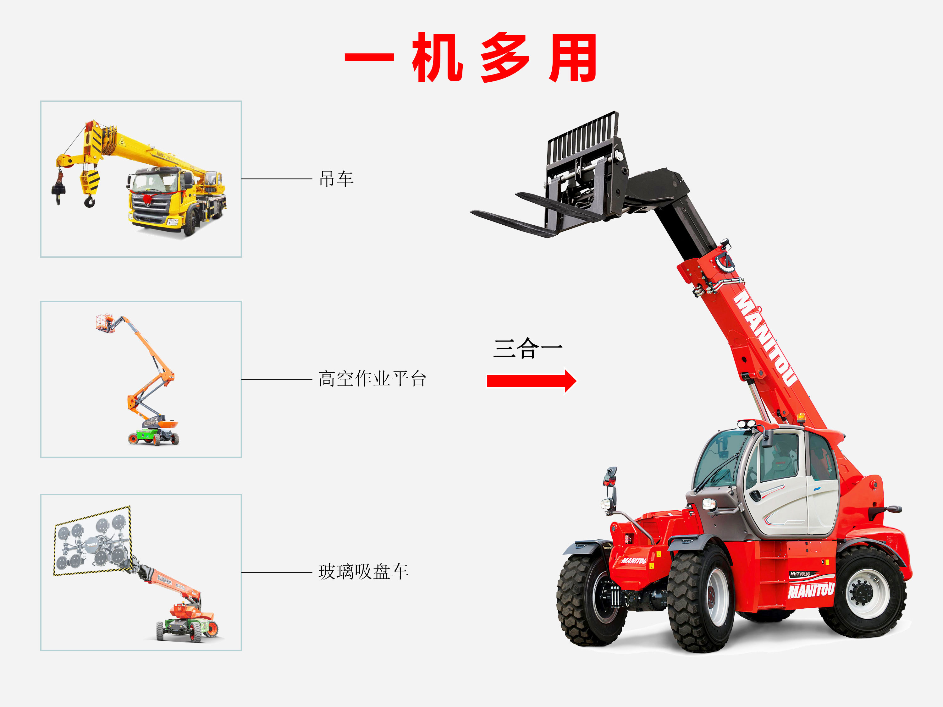 ? 使用一臺3合1設備(伸縮臂叉裝車,起重機和高空作業平臺)。